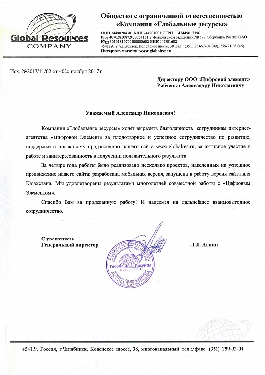 Компания «Глобальные ресурсы» хочет выразить благодарность сотрудникам интернет-агентства «Цифровой Элемент» за плодотворное и успешное сотрудничество по развитию, поддержке и поискового продвижению нашего сайта, за активное участие в работе и заинтересованность в получении положительного результата. За четыре года работы было реализовано несколько проектов, нацеленных на успешное продвижение нашего сайта: разработана мобильная версия, запущена в работу версия сайта для Казахстана. Мы удовлетворены результатами многолетней совместной работы с «Цифровым Элементом».
