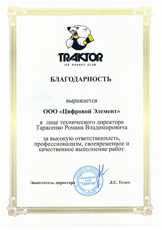 Выражаем благодарность ООО «Цифровой Элемент» в лице технического директора за высокую ответственность, профессионализм, своевременное и качественное выполнение работ.