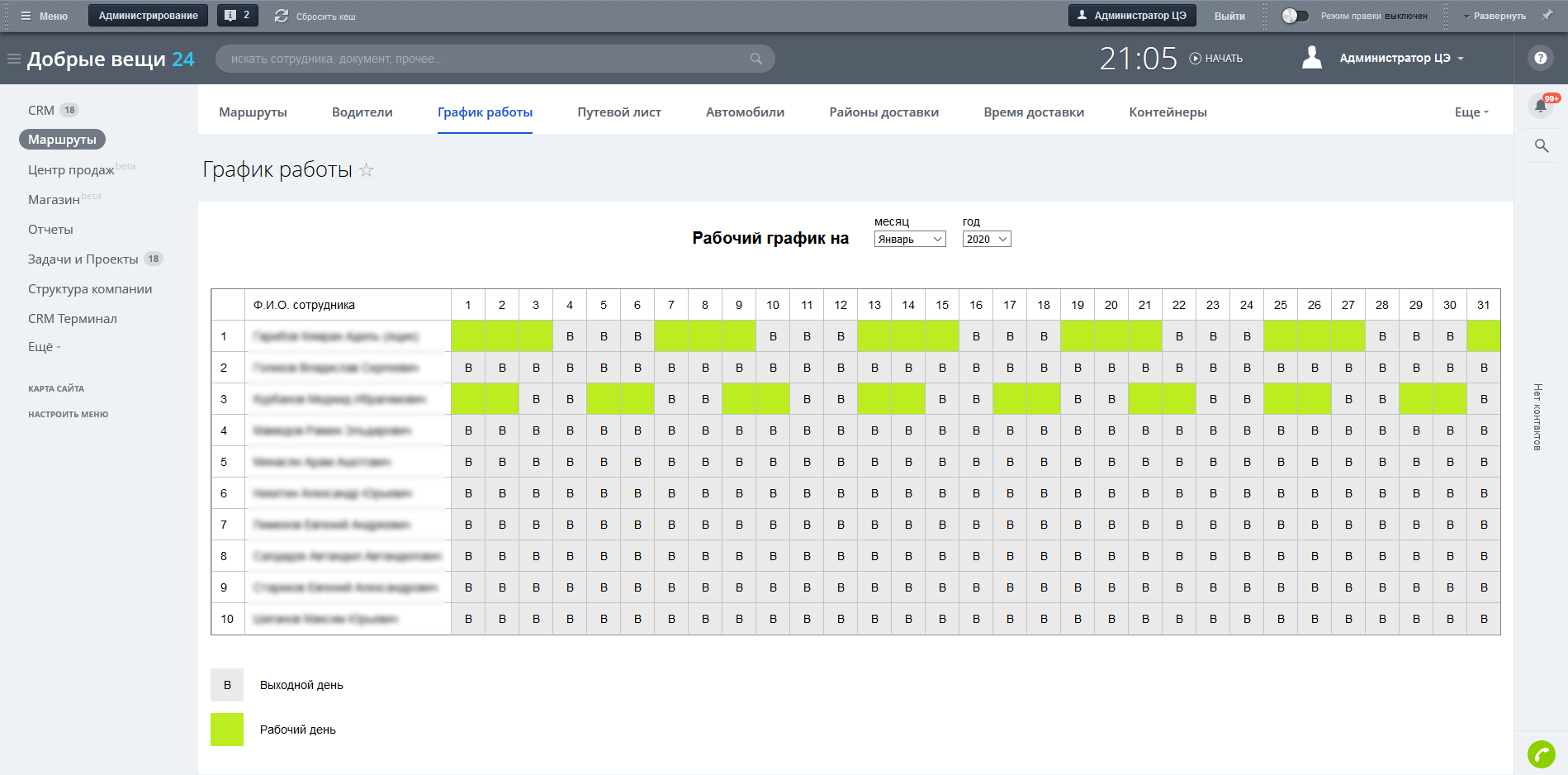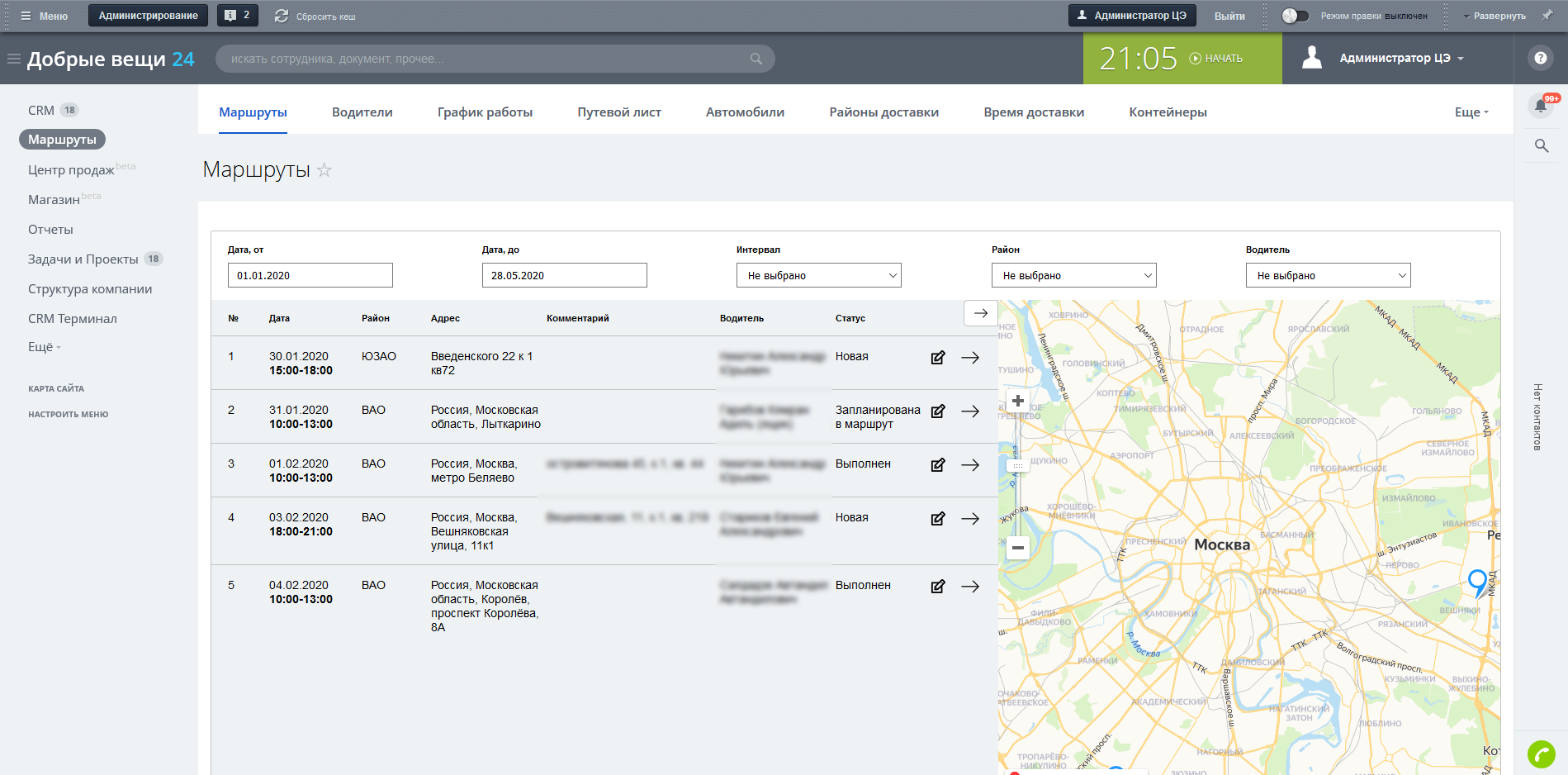 • Отчетность по забору вещей и по выполненным маршрутам.