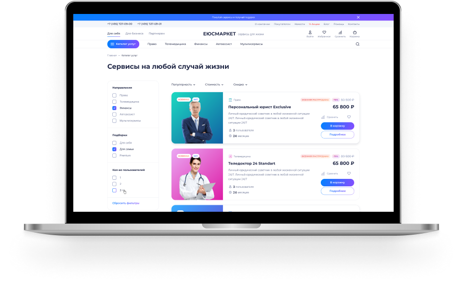 Пользователю доступна фильтрация сервисов по определенным характеристикам на странице каталога и направления, возможность добавить сервис в корзину, в избранное, к сравнению, далее оплатить сервисы и управлять подпиской на них в личном кабинете.
